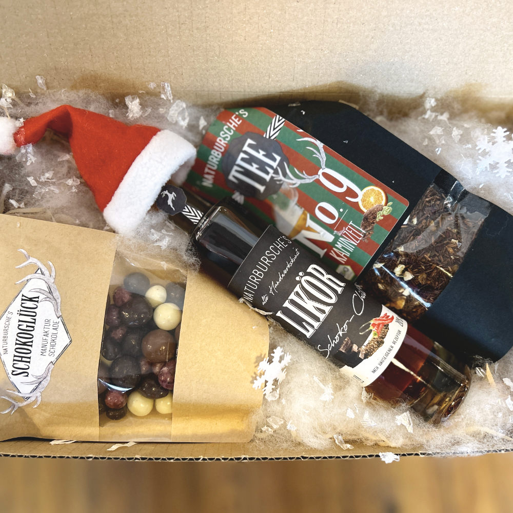 als Geschenk im Karton mit natürlich beiger Holzwolle und weihnachtlicher Schnee-Dekoration
