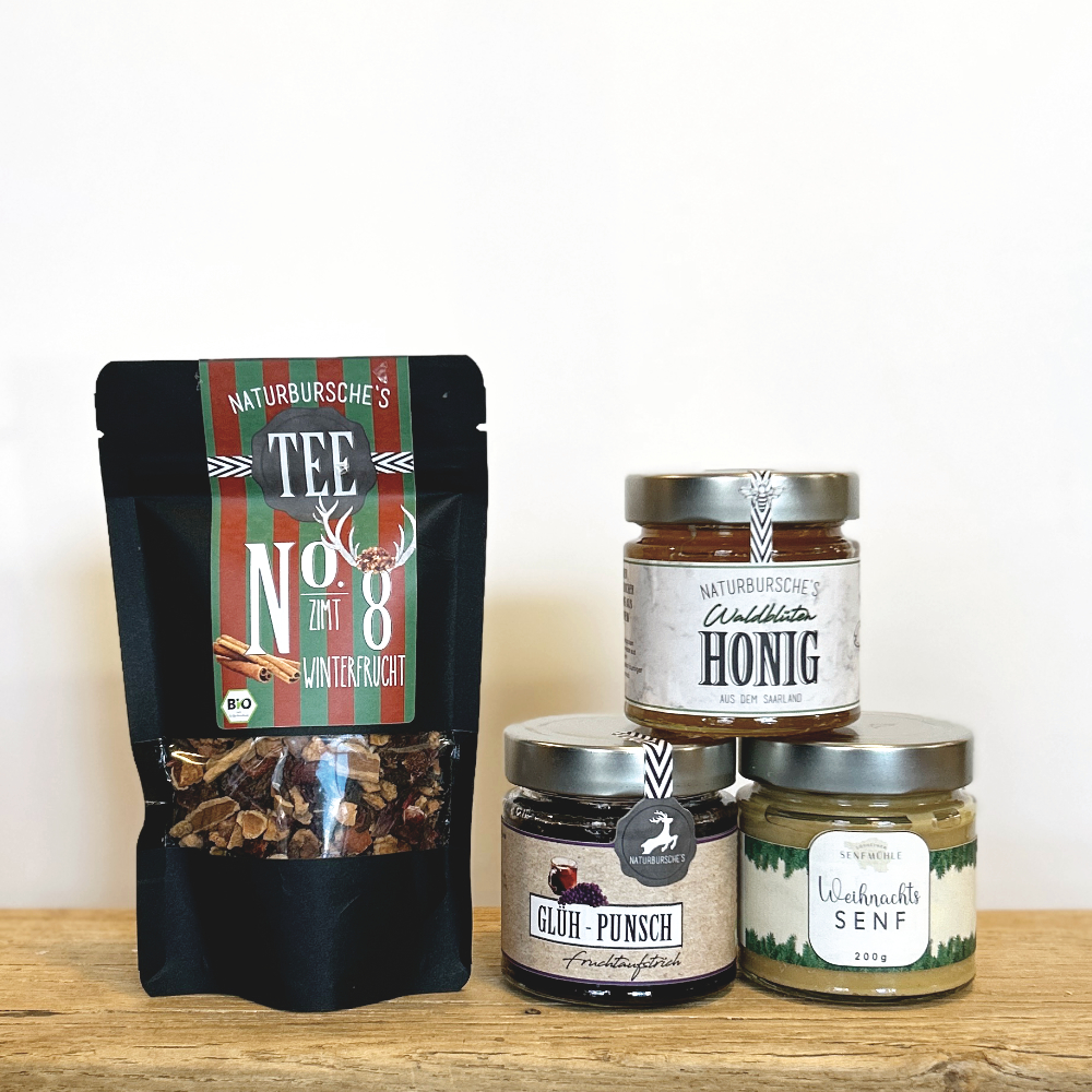 als Geschenk im Karton mit natürlich beiger Holzwolle und weihnachtlicher Schnee-Dekoration