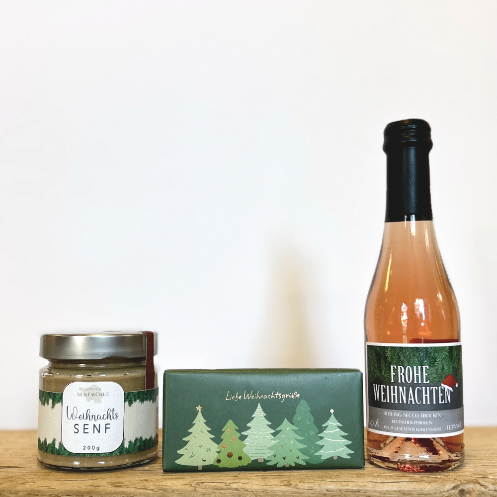 Klein, fein herzlich – Schokolade, Weihnachtssenf und Rohling-Secco – liebevoll zusammengestellt als Geschenk – perfekt für Mitarbeiter