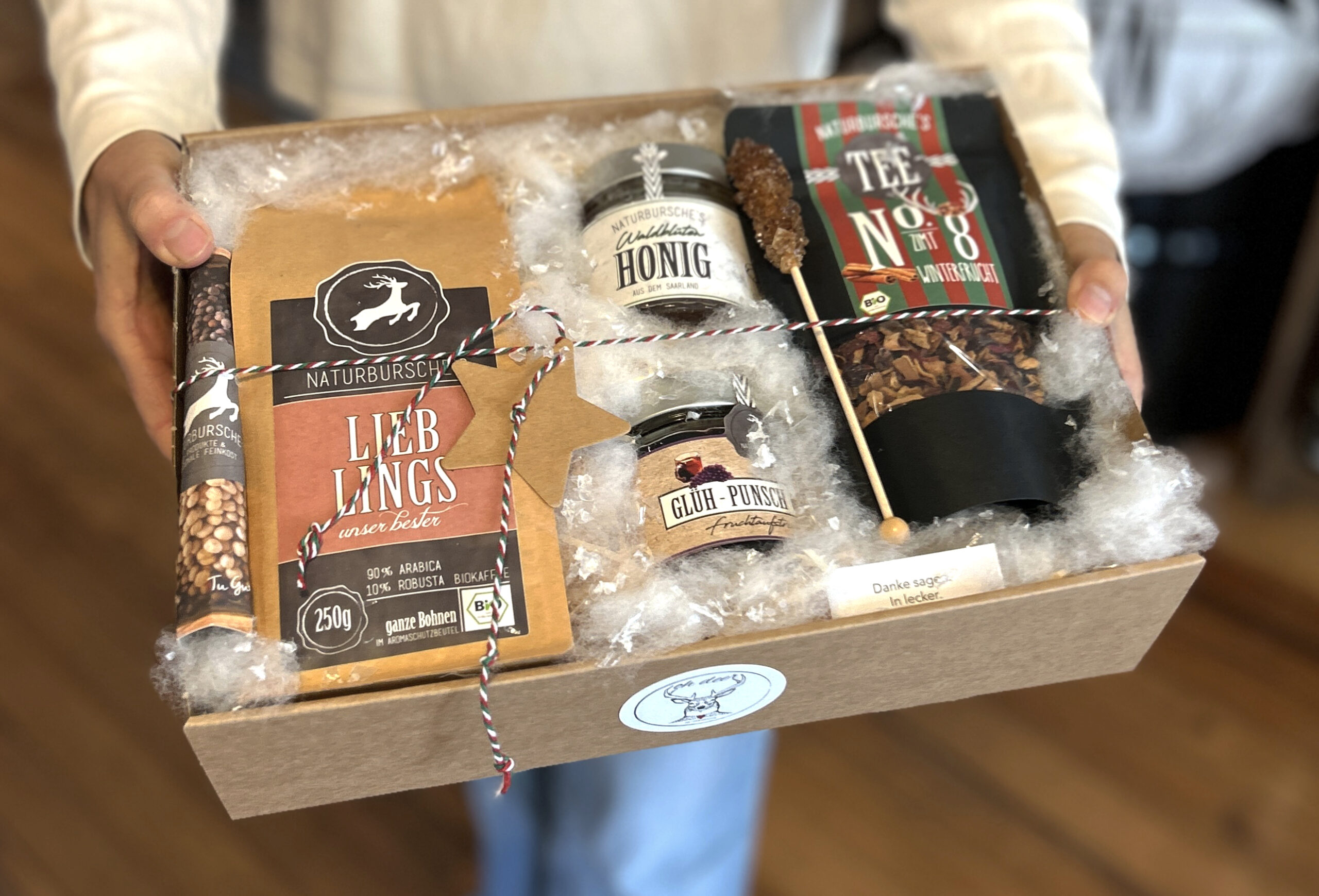 als Geschenk im Karton mit natürlich beiger Holzwolle und weihnachtlicher Schnee-Dekoration