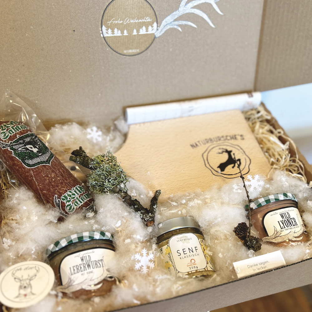 Diese Weihnachten wird es wild! Verschenke unendlichen Genuss mit dieser Box – regionales Wildfleisch, ein besonderes Brettchen und ein toller Biosenf